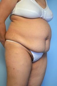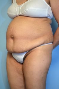 I think I achieved a good result with almost 5 liters of liposuction of the abdomen and flanks combined with a tummy tuck. Although I can tighten the abdominal muscle significantly I can't correct the epigastric bulge. This is the bulge, you can see in this patient, that is due to internal fat. The only way to correct this bulge is via weight loss. In addition her umbilical hernia became much more noticeable after the surgery. Due to aggressive liposuction and the tummy tuck I couldn't fix the umbilical hernia at the same time.