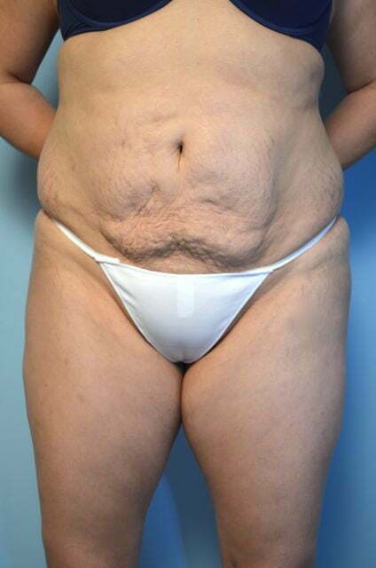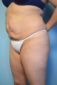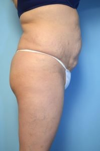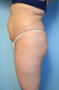 This patient underwent liposuction of the abdomen and flanks, by another plastic surgeon, several years ago. Unfortunately, it left her with a lot of contour irregularity in the periumbilical and infraumbilical regions. By doing more liposuction of the abdomen and flanks and a full tummy tuck with muscle repair we achieved a much better result. She still has an umbilical hernia which I have suggested she get repaired by a general surgeon.