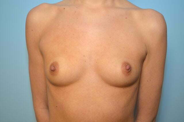 This was a tough case. What isn't appreciated in the photos is the fact that her right thoracic ribs are displaced forward and the left are back. I used sizers in the OR but the larger sizers made her left breast larger than the right. Often we have to accept that every woman's breasts are asymmetric.