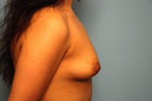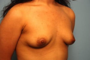 This case illustrates a couple of things. First, this patient's skin color is known as a Fitzpatrick 4. This is typical of Hispanics, Asians and some Middle Easterners. I don't like to use the periareolar incision for these patients as it could become hypopigmented (less color, as in this patient) or hypertrophic (thickened). She insisted on the incision. If the color does not improve I will suggest she have the scar tattooed. Second, her areolas have very indistinct borders and thus again the periareolar incision would not be the best choice. Finally, both of her breasts have constrictures at the bases that were released improving the overall appearance.