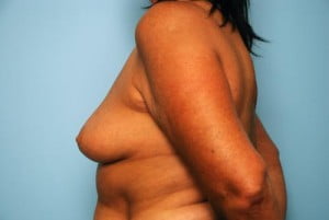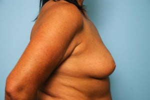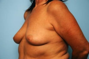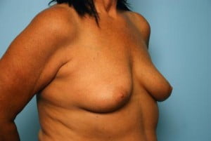 This patient had loss of upper pole (top part of the breast) fullness and moderate sagging. With low profile implants the upper poles were corrected. The the periareolar lift the sagging was corrected.
