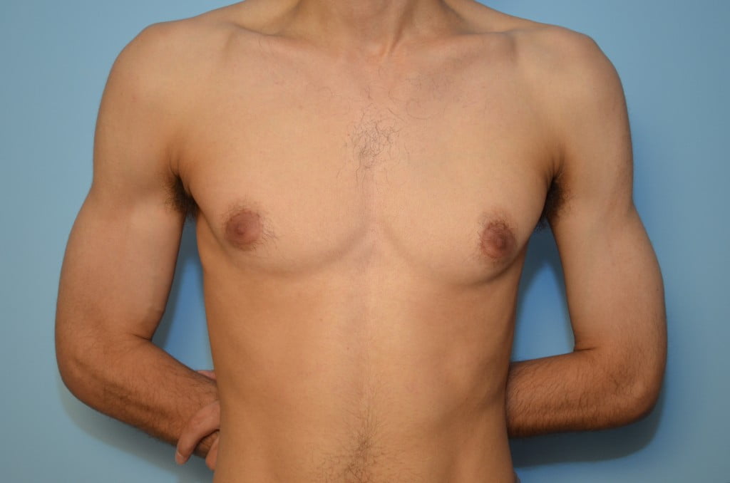 This patient has grade 1 gynecomastia. Via a small amount of liposuction and excision or removal of the breast tissue we achieved a very nice result. Many surgeons would only do excision here. However, there is a high likelihood of a donut deformity with excision alone.