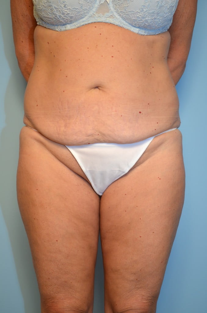 This lovely 51-year-old patient's primary issue was excess fat in the abdomen and flanks. In addition she had a small amount of excess skin of the lower abdomen. She underwent aggressive tumescent liposuction of the abdomen and flanks. Following this a mini tummy tuck with repair of the rectus muscles below the belly button was performed.